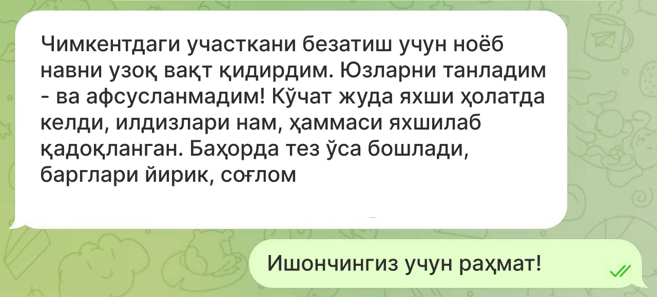 Кўчат кўкармаса, уни бепул алмаштирамиз.